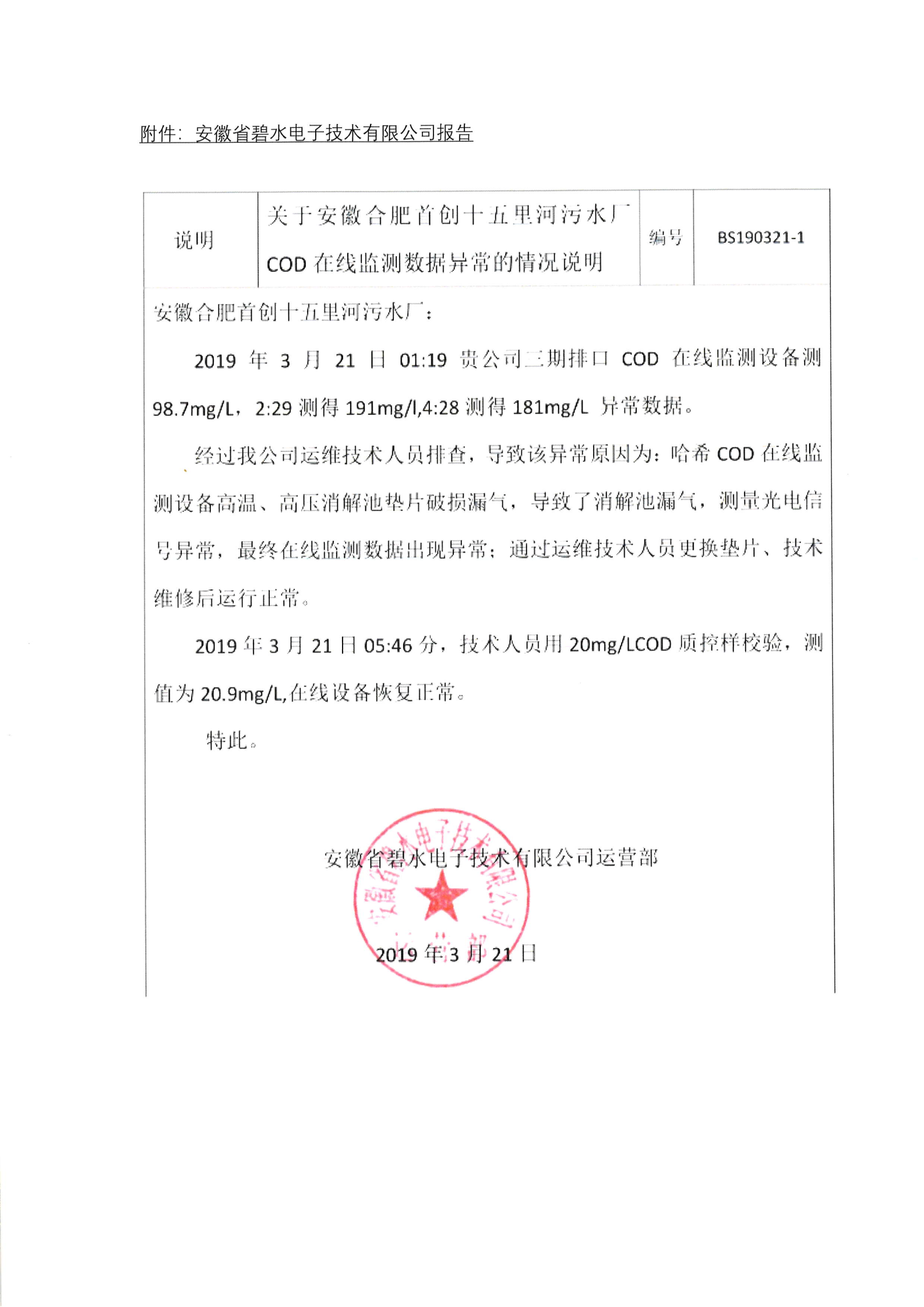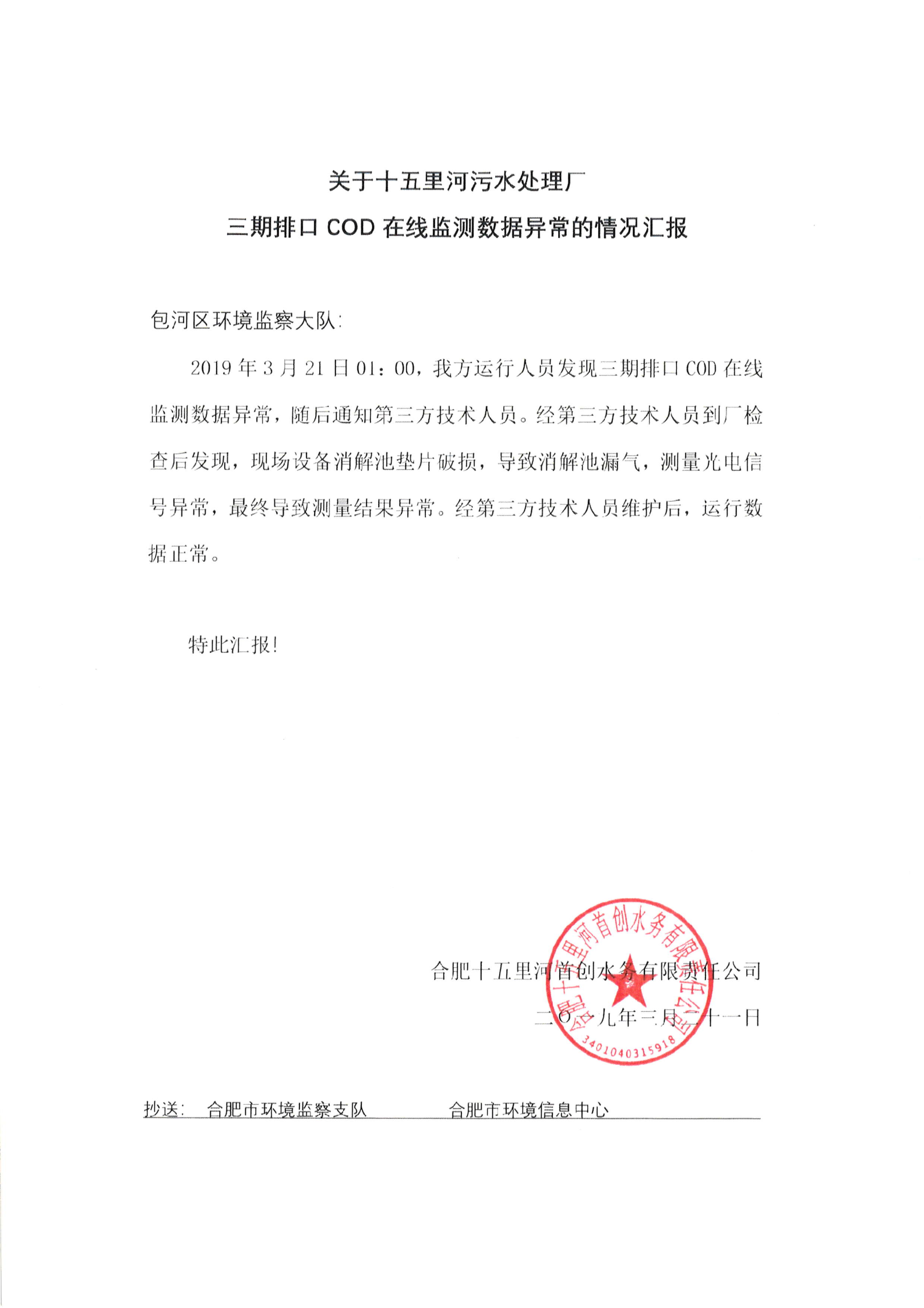 關(guān)于十五里河污水處理廠三期排口COD在線監(jiān)測(cè)數(shù)據(jù)異常的情況匯報(bào)